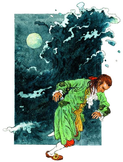 Гулливер поплыл один куда глаза глядят, подгоняемый ветром и приливом. То и дело пробовал он нащупать дно, но дна всё не было. А плыть дальше он уже не мог: намокший кафтан и тяжёлые, разбухшие башмаки тянули его вниз. Он захлёбывался и задыхался.