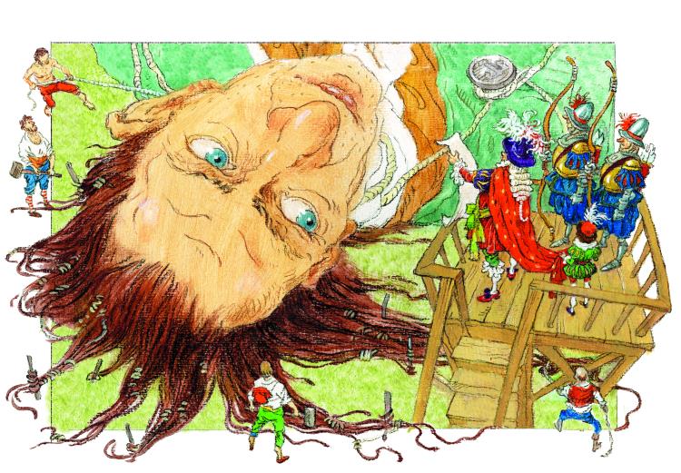 Гулливер слегка повернул голову – повернуть её больше не давали верёвочки и колышки – и возле самой своей головы увидел только что построенный деревянный помост. Несколько человечков прилаживали к нему лестницу.