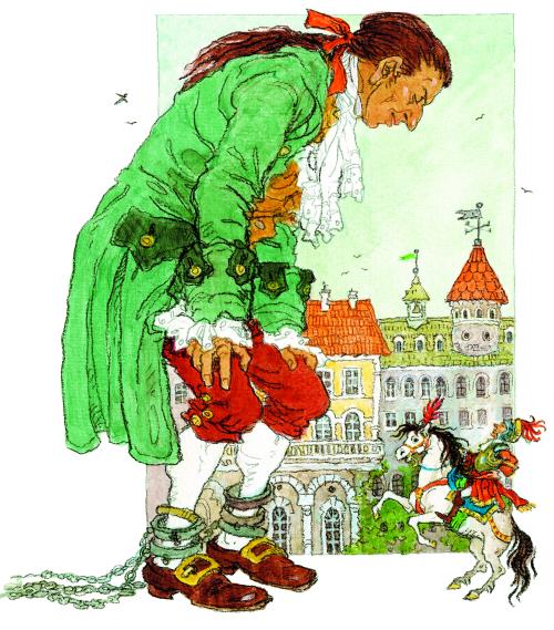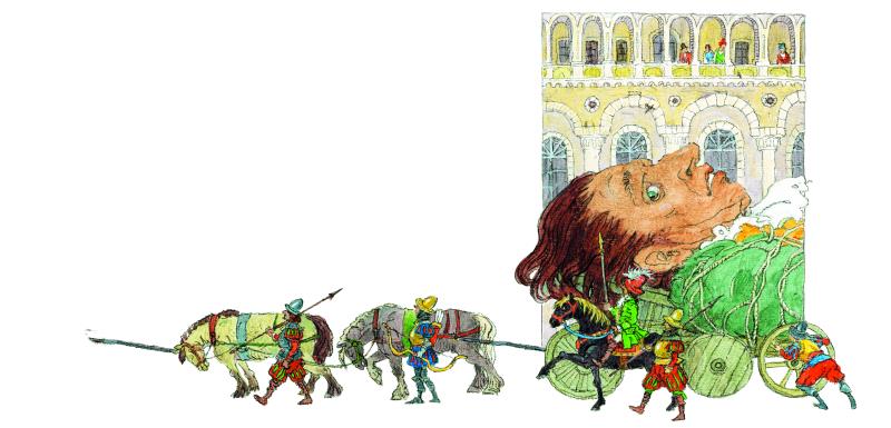 Полторы тысячи самых крупных лошадей из придворных конюшен, каждая ростом с новорождённого котёнка, были запряжены в телегу по десятку в ряд. Кучера взмахнули бичами, и телега медленно покатилась по дороге в главный город Лилипутии – Мильдендо.