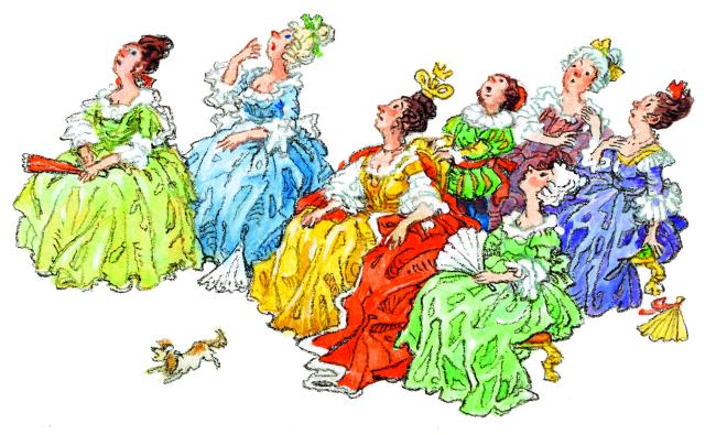 Императрица вышла и уселась в кресло, расправив платье. Вокруг неё на золотых скамеечках уселись её придворные дамы.