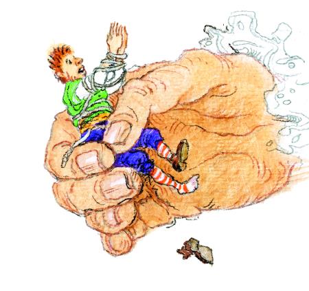 Человечек ухватился за палец Гулливера обеими руками и пронзительно закричал.