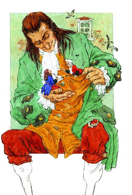 Гулливер не стал с ними спорить. Он взял обоих чиновников в руки и опустил сначала в один карман кафтана, а затем в другой, а потом перенёс их в карманы штанов и жилета.