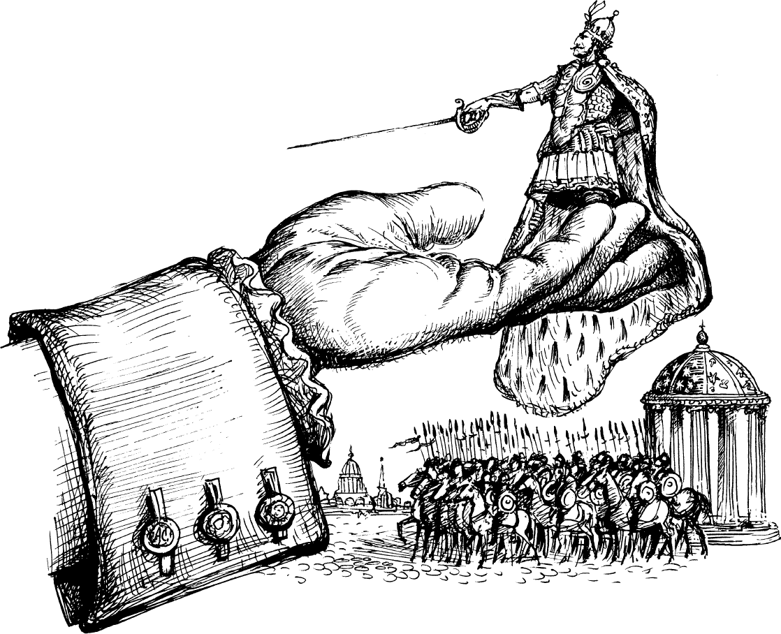 Таким образом, исполняя повеление вашего величества и тщательно осмотрев все карманы Человека-Горы, мы перешли к дальнейшему обследованию и открыли на нем пояс, сделанный из кожи какого-то громадного животного; на этом поясе с левой стороны висит палаш длиною в пять раз более среднего человеческого роста, а с правой – сумка или мешок, разделенный на два отделения, из коих в каждом можно поместить трех подданных вашего величества. Мы нашли в одном отделении сумки множество шаров из крайне тяжелого металла; каждый шар, будучи величиной почти с нашу голову, требует большой силы, чтобы поднять его; в другом отделении лежала куча каких-то черных зерен не очень большого объема и веса; мы могли поместить на ладони до пятидесяти таких зерен.
