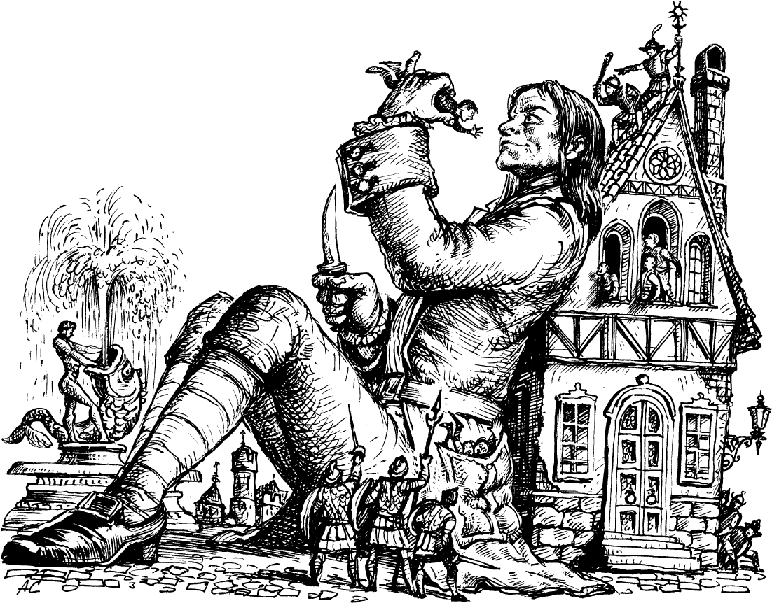 Спустя два часа двор удалился, и я был оставлен под сильным караулом для охраны от дерзких и, может быть, даже злобных выходок черни, которая с нетерпением теснилась вокруг меня, стараясь протолкаться как можно ближе; у некоторых достало даже бесстыдства пустить в меня несколько стрел, в то время как я сидел на земле у дверей моего дома; одна из этих стрел едва не угодила мне в левый глаз. Однако полковник приказал арестовать шесть зачинщиков и решил, что для них самое лучшее наказание – это связать их и отдать в мои руки. Солдаты так и сделали, подталкивая ко мне озорников тупыми концами пик; я взял их всех в правую руку и пятерых положил в карман камзола; что же касается шестого, то я сделал вид, будто хочу съесть его живьем. Бедный человечек отчаянно завизжал, а полковник и офицеры пришли в сильное беспокойство, особенно когда увидели, что я вынул из кармана перочинный нож. Но скоро я успокоил их: ласково смотря на моего пленника, я разрезал связывавшие его веревки и осторожно поставил на землю; он мигом убежал. Точно так же я поступил и с остальными, которых поочередно вынимал из кармана. И я увидел, что солдаты и народ остались очень довольны моим милосердием, которое оказало мне также большую услугу при дворе.
