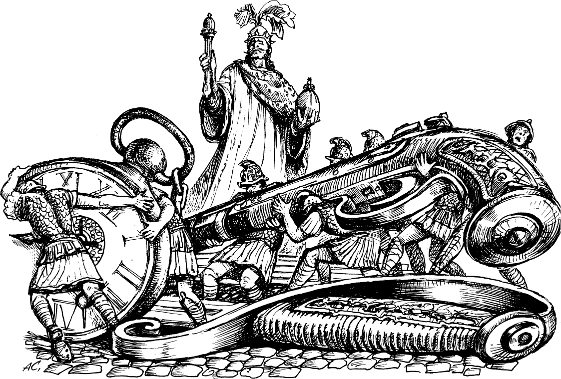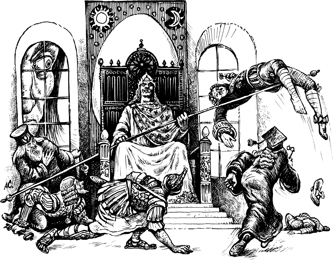 Клефрин Фрелок Марси ФрелокКогда эта опись была прочитана императору, его величество потребовал, хотя и в самой деликатной форме, чтобы я отдал некоторые перечисленные в ней предметы. Прежде всего он предложил вручить ему палаш, который я снял вместе с ножнами и со всем, что было при нем. Тем временем император приказал трем тысячам отборных солдат (охранявших в этот день его величество) окружить меня на известном расстоянии и держать на прицеле луки, чего я, впрочем, не заметил, так как глаза мои были устремлены на его величество. Император пожелал, чтобы я обнажил палаш, который хотя местами и заржавел от морской воды, но все-таки ярко блестел. Я повиновался, и в тот же момент все солдаты испустили крик ужаса и удивления: отражавшиеся на стали лучи солнца ослепляли их, когда я размахивал палашом из стороны в сторону. Его величество, храбрейший из монархов, испугался меньше, чем я мог ожидать. Он приказал мне вложить оружие в ножны и возможно осторожнее бросить его на землю футов на шесть от конца моей цепи. Затем он потребовал показать полый железный столб: дело шло об одном из моих карманных пистолетов. Я вынул пистолет и по просьбе императора растолковал, как мог, его употребление; затем, зарядив его только порохом, который благодаря герметически закрытой пороховнице оказался совершенно сухим (все предусмотрительные моряки принимают на этот счет особые меры предосторожности), я, предупредив императора, чтобы он не испугался, выстрелил в воздух. На этот раз удивление и ужас были гораздо сильнее, чем при виде моего палаша. Сотни человек попадали в обморок, и даже сам император, хотя и устоял на ногах, некоторое время не мог прийти в себя. Я вручил императору оба пистолета и так же поступил с пулями и порохом, но просил его величество держать последний подальше от огня, так как от малейшей искры он может воспламениться и взорвать на воздух императорский дворец. Равным образом я вручил ему свои часы, которые император осмотрел с большим любопытством и приказал двум самым дюжим гвардейцам унести их, надев на шест и положив шест на плечи, вроде того как носильщики в Англии таскают бочонки с элем. Всего более поразил императора непрерывный шум часового механизма и движение минутной стрелки, которое ему было хорошо видно, потому что лилипуты обладают более острым зрением, чем мы. Он предложил ученым высказать свое мнение относительно этой машины, но читатель и сам догадается, что ученые не пришли ни к какому единодушному заключению, и все их предположения, которых, впрочем, я хорошенько не понял, были весьма далеки от истины; затем я сдал серебряные и медные деньги, кошелек с девятью крупными и несколькими мелкими золотыми монетами, нож, бритву, гребень, серебряную табакерку, носовой платок и записную книжку. Палаш, пистолеты и сумка с порохом и пулями были отправлены на телегах в арсенал его величества, а остальные вещи возвращены мне.