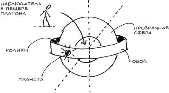 Даже при всей сложности модели Птолемея движение планет не вполне ей соответствовало. Для решения этой проблемы Птолемей ввел два дополнительных усложнения: во-первых, он переместил Землю (пещера Платона на рис. 5) из точки, являющейся центром вращения сферы, в точку, смещенную от центра, которая получила название «эксцентр». Во-вторых, он отказался от платоновского принципа движения планет с постоянной скоростью, допустив, что движение планеты выглядит равномерным, когда оно происходит из воображаемой точки в пространстве, называемой «эквант».