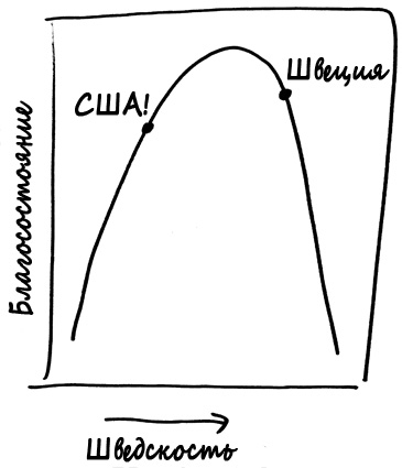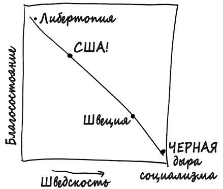 Ось x отображает здесь меру «шведскости»[32], а ось y – некую меру благосостояния. Не имеет значения, в каких именно единицах отображены эти показатели. Суть вот в чем: согласно этому графику, чем выше у вас мера шведскости, тем в худшей ситуации находится ваша страна. Шведы, люди далеко не глупые, поняли это и начали двигаться по графику в северо-западном направлении, к благосостоянию, которое обеспечивает свободный рынок. Однако Обама движется не в том направлении.