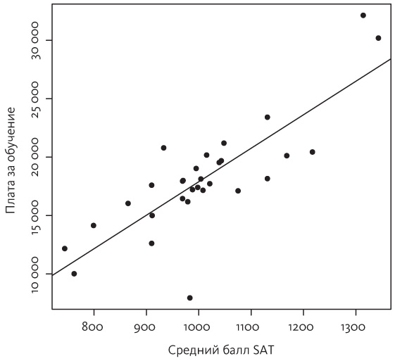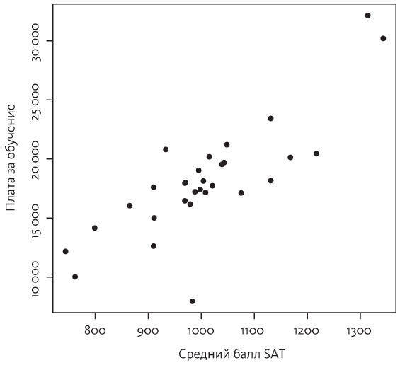 Вот как это работает. Вы хотите установить взаимозависимость между двумя параметрами, скажем между стоимостью обучения в университете и средним баллом по отборочному тесту SAT принятых на учебу студентов. Возможно, вы считаете: чем выше средний балл SAT, тем дороже учебное заведение, – но посмотрите на данные, которые говорят, что это далеко не универсальный закон. В Университете Элона, расположенном на окраинах Берлингтона (штат Северная Каролина), средний совокупный результат по математике и английскому языку составляет 1217 баллов; при этом университет взимает плату за обучение в размере 20 441 доллара в год. Обучение в Колледже Гилфорда, расположенном рядом, в городе Гринсборо, обходится немного дороже – 23 420 долларов, но средний результат первокурсников по SAT составляет там всего 1131 балл.