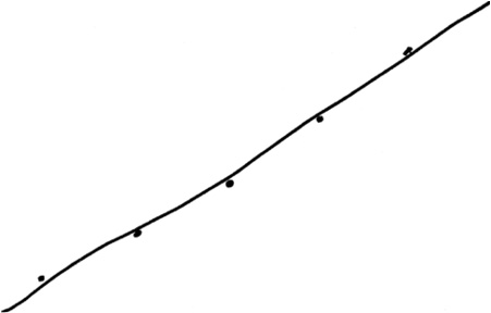 Построенная вами линия представляет собой весьма точную модель движения ракеты: за каждую минуту ракета поднимается на определенное фиксированное расстояние, скажем на 400 метров. Через час ракета окажется в 24 километрах над поверхностью земли. Когда же она опустится на поверхность? Никогда! Направленная вверх наклонная прямая линия по-прежнему стремится вверх. Именно так ведут себя прямые.