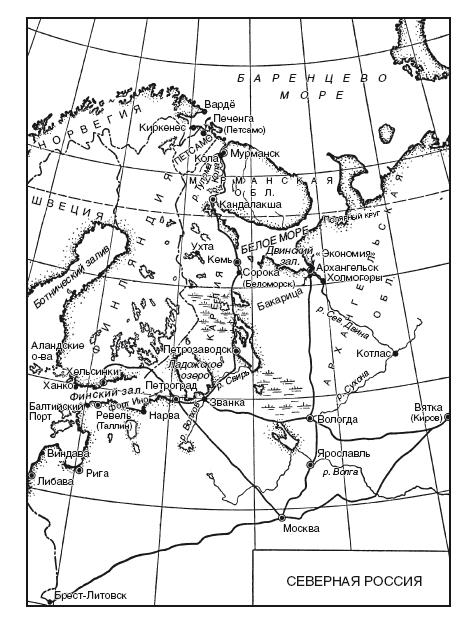 Нельзя сказать, что Мурманск 1917–1918 годов был привлекательным местом. Расположенный почти на самом полярном круге, на широте 69 градусов (примерно на такой же широте побережье Аляски смыкается с канадской границей), этот город наряду с близлежащим норвежским Киркенесом представлял собой самое северное из постоянных городских поселений. В то время Мурманск состоял исключительно из бревенчатых домов, деревянных бараков и складских сараев. Американцы считали, что он напоминает ранний американский лагерь лесорубов: здесь не было ни канализационной системы, ни мощеных улиц, а открытые места, как правило, оказывались заваленными строительным мусором. В течение долгой зимы эти замерзшие кучи росли все выше и выше только для того, чтобы снова растаять с наступлением поздней весенней оттепели и раствориться в песчаных трясинах, волей-неволей служивших улицами в теплое время года. Как и во всех арктических местах, в летний период здесь не заходило солнце, но воздух оставался прохладным, а небо слишком часто становилось темным от комариных туч, поднимающихся с бескрайних материковых болот.