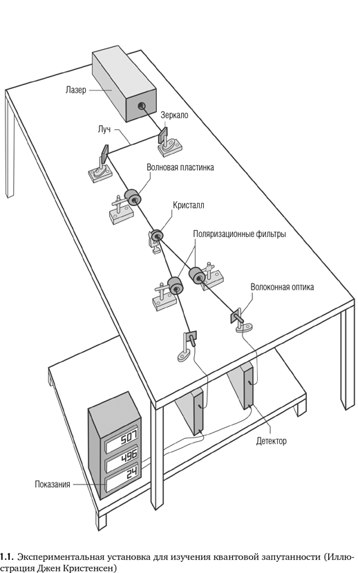 Если кто и взял на себя задачу показать миру, как выглядит квантовая запутанность, так это Гальвез. Запутанность – это наиболее известный тип нелокальности из тех, что наблюдались современными физиками, и именно он пугал Эйнштейна. Слово entanglement («запутанность») в английском языке имеет коннотации романтической связи: особые и, возможно, мучительные взаимоотношения. Две запутанные друг с другом частицы не в прямом смысле сплетаются, как клубки пряжи, скорее между ними существует особая связь, для которой пространство не имеет значения. Вы можете наблюдать это явление, создавая, отклоняя и измеряя лучи света – не обычные лучи от фонарика, а пучки запутанных фотонов. В первых версиях этого эксперимента, проведенных в 1970-х гг. в Беркли и в Гарварде, были задействованы хитроумные изобретения «безумных ученых» вроде раскаленных печей, штабелей оконных стекол и грохочущих телетайпов. Гальвез воспользовался Blue-ray лазерами и оптоволокном для того, чтобы уменьшить размеры установки, так что теперь она умещается на школьной парте.
