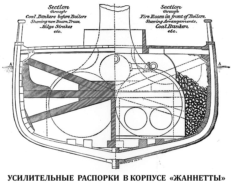Это был момент крайней опасности. Если лёд сомкнётся снова, «Жаннетта» будет раздавлена, как яичная скорлупа. Лёд расступился почти на тысячу ярдов, а затем медленно сблизился. Бедный корабль заскрипел и застонал от страшного напряжения, но, к счастью, окружающий судно лёд послужил ему защитой. Палубные настилы вспучились, пакля и смола выступили из швов, и почти полное ведро воды, стоявшее на квартердеке, наполовину выплескалось от сотрясений. Почти никто не мог уснуть; те, кому это удавалось, спали в одежде. И всё же дисциплина на корабле была безупречной. Матросы пели и шутили с показным хладнокровием, очищая палубы от льда или откалывая нависающие над фальшбортом глыбы. Мощные внутренние распорки, установленные на верфи в Калифорнии, хорошо выдерживали давление; наконец, напирающая на борт льдина с грохотом переломилась, обломок её обрушился на судно и столкнул корабль с его ложа в полынью. Льдины снова начали обступать «Жаннетту», но с наступлением темноты вокруг неё сформировался молодой лёд, и вскоре она снова была в ледяном плену, чтобы никогда больше не быть освобождённой до рокового дня 12 июня 1881 года.