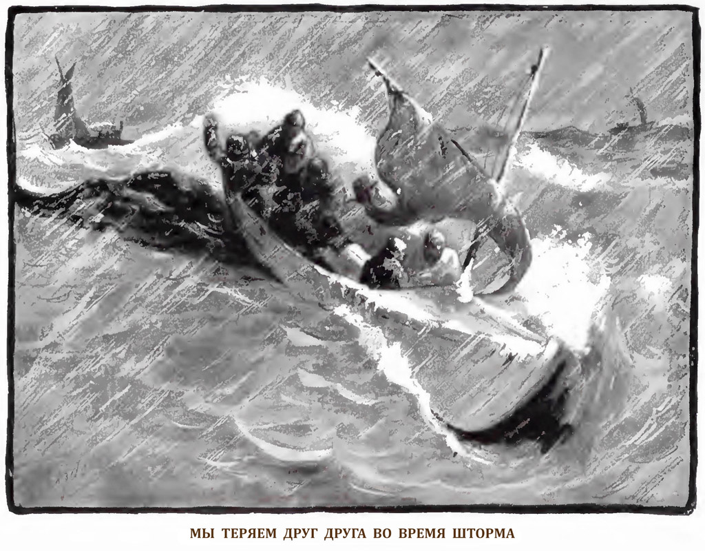 Наш вельбот стремительно нёсся вперёд, быстро удаляясь от первого куттера. Услышав, как кто-то воскликнул, что Делонг подаёт сигнал Чиппу, я обернулся и посмотрел туда, где был второй куттер. Какое-то мгновение его не было видно, но вскоре он мелькнул в сумерках на гребне волны и снова скрылся из виду. Когда куттер снова появился на фоне бушующего моря, он находился боком к волне, и я мог различить человека, пытающегося освободить парус, зацепившийся за мачту; в следующую секунду он снова исчез, и потом я не видел уже ничего, кроме пенных бурунов холодного тёмного моря. В этот момент второй куттер находился примерно в тысяче ярдов позади нас, и я не сомневаюсь, что в этот момент он затонул. Первый куттер в это время находился, вероятно, где-то посередине между нами. Позднее разговор с двумя единственными оставшимися в живых членами экипажа первого куттера (Ниндеманном и Норосом) подтвердил мою уверенность в этом; они тоже были свидетелями сцены, как я её описал, и утверждают, что, по общему мнению команды Делонга, я разделил ту же участь одновременно с Чиппом.