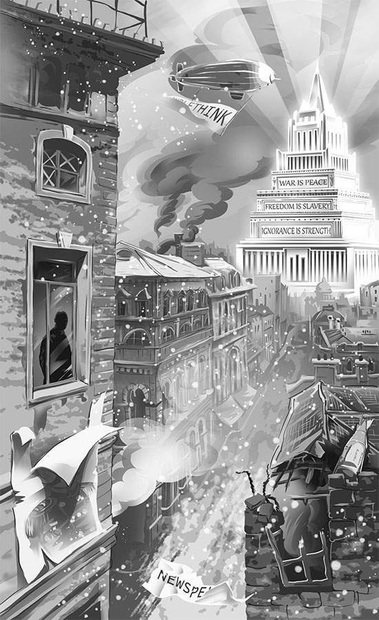 The Ministry of Truth – Minitrue, in Newspeak – was startlingly different from any other object in sight. It was an enormous pyramidal structure of glittering white concrete, soaring up, terrace after terrace, 300 metres into the air. From where Winston stood it was just possible to read, picked out on its white face in elegant lettering, the three slogans of the Party: