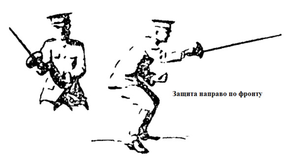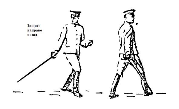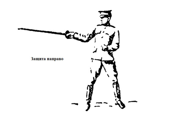 8. 1. Направо. 2. Защита. Перенести руку на угол 90 градусов вправо, локоть отодвинут от тела и согнут, предплечье и клинок почти горизонтально и направлены вправо, острие на уровне груди противника, лезвие назад. Ногти пальцев вниз, голова и взгляд вправо или по направлению острия сабли. Корпус выпрямить так, что если бы кавалерист был в седле, то он сидел бы прямо (рис. 3).