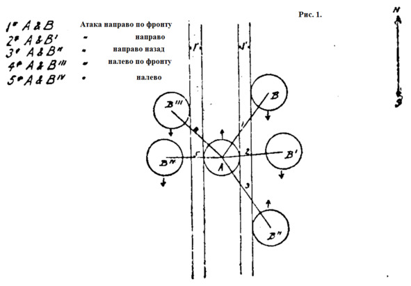 В этом и последующих упражнениях, в которых люди действую в пешем порядке, необходимо следить, чтобы они не стояли лицом к лицу вплотную. В конном бою это невозможно – лошади не будут работать в таком положении, если могут это избежать. Следовательно, если «А» обращен лицом на север и атакуется «В» справа по фронту, «В» будет развернут лицом на юг, то расстояние между правыми ногами сражающихся должно быть постоянно не меньше фута.