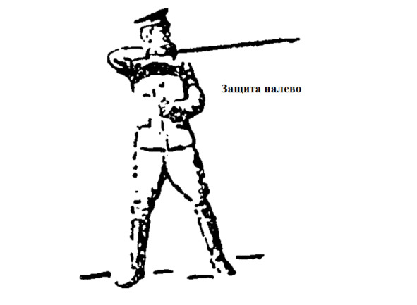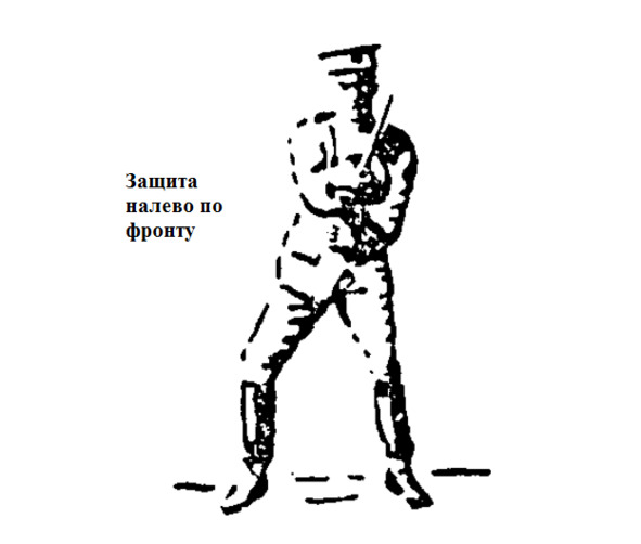 9. 1. Налево. 2. Защита. Перенести руку к левой груди, ногти вниз, локоть отодвинут от тела, предплечье и клинок почти горизонтально и направлены влево, острие на уровне груди противника, лезвие направлено вперед, голова и взгляд влево или по направлению острия сабли. Корпус выпрямить так, что если бы кавалерист был в седле, то он сидел бы прямо (рис. 4).