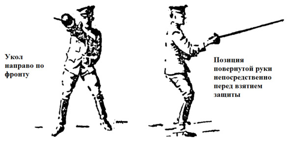 12. Находясь в защите. 1. Направо по фронту. 2. Укол. Без движения телом двинуть саблю в том направлении, в которое она направлена, с максимальной силой и скоростью, слегка поворачивая запястье влево, пока лезвие не будет направлено вверх и вправо; закрыться сразу после. Убирая руку, повернуть запястье вправо, пока ногти не будут направлены вверх, при окончательном закрытии повернуть руку ногтями вниз и закрыться, как положено. Цель этого вращения – более надежное удержание сабли при извлечении ее из тела. Это движение должно выполняться всегда во всех уколах и выпадах направо. (рис. 6).