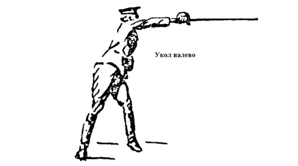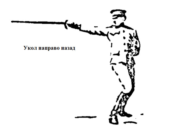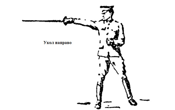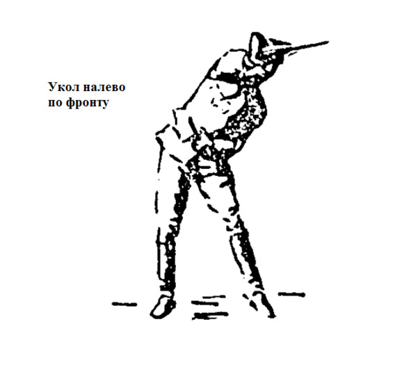 17. Уколы объясняются из соответствующих защит для простоты. После того, как они освоены, они должны выполняться из любой защиты, как и из соответствующей. Также должны выполняться и два и более укола по команде. Например, из любой защиты: 1. Направо по фронту и налево по фронту. 2. Направо по фронту и направо и т. п. 2. Укол. Нанести укол с максимальной скоростью в указанных направлениях, а потом вернуться в исходную защиту. Или, находясь в любой защите: 1. Направо по фронту (налево по фронту или направо и т.п.). 2. Два раза. 3. Укол. Колоть дважды в указанных направлениях и вернуться в исходную защиту.