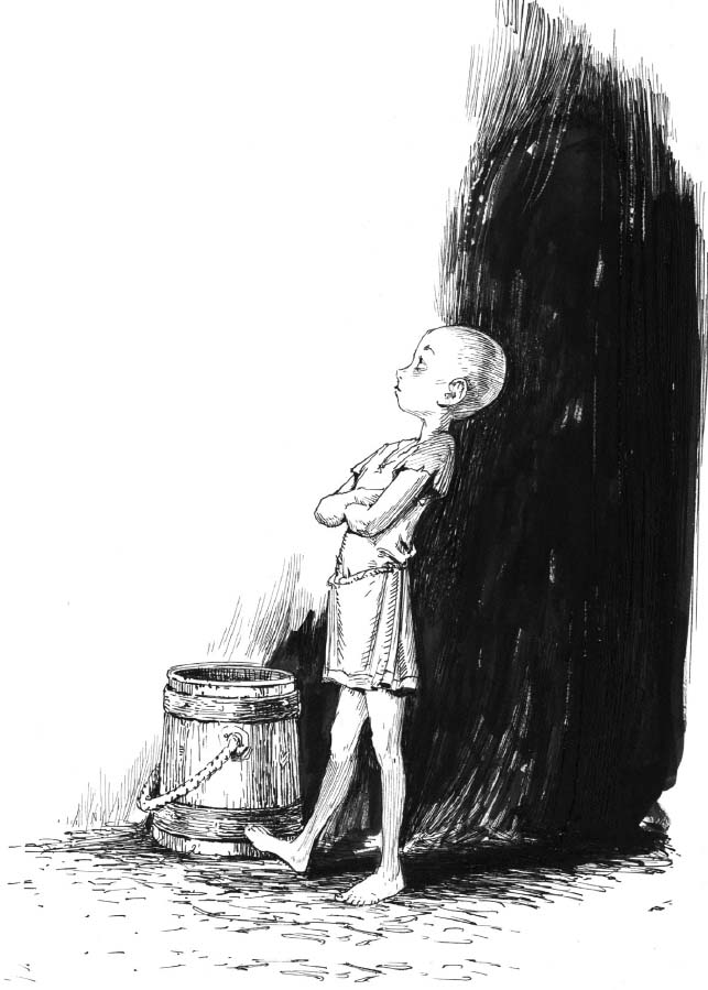 As he dismounted, a naked boy emerged dripping from the stream and began to dry himself on a roughspun brown cloak. “Are you the stableboy?” Dunk asked him. The lad looked to be no more than eight or nine, a pasty-faced, skinny thing, his bare feet caked in mud up to the ankle. His hair was the queerest thing about him. He had none. “I’ll want my palfrey rubbed down. And oats for all three. Can you tend to them?”