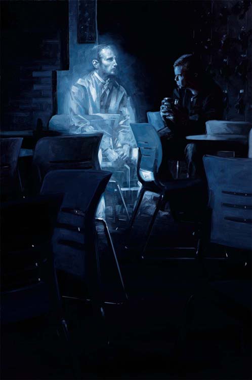 “Hello,” said the spectre, the bright shade of a lithe, pale-eyed young man with white hair. He was dressed in clothing twenty years out-of-date; a loose blue pastel shirt that ballooned at his wrists, clinging white trousers with built-in boots. They could see through him, and his own eyes did not see them at all.