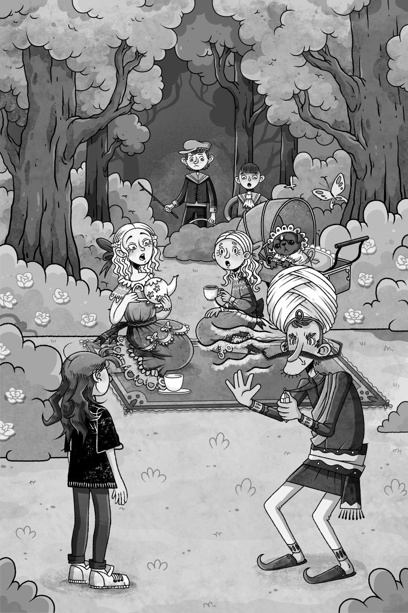 К этому моменту дети уже вопили так громко, что привлекли внимание садовника. Когда он выбежал на лужайку, старичок в чалме бросил на него рассерженный взгляд и с помощью прозрачного кристалла, висевшего у него на шее, проделал то, что Молли хорошо умела делать сама: остановил время.