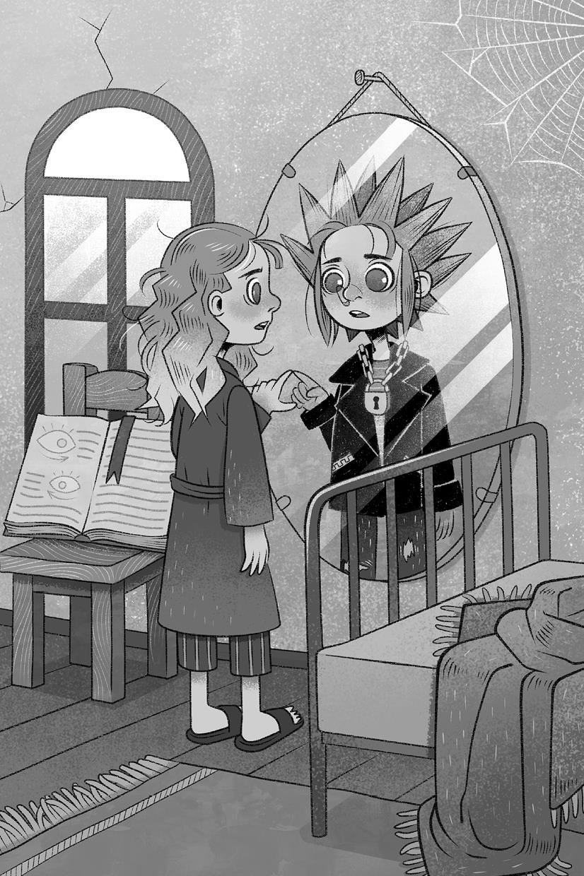 Значит, Молли загипнотизировала Эдну с помощью глаз? Девочка была уверена, что больше всего ей помогли ложка, послужившая маятником, и голос. Она подошла к зеркалу и всмотрелась в себя. Лицо, как всегда, было розовое, пятнистое, нос картошкой. Она вгляделась в свои зелёные, близко поставленные глаза. Они встретили её напряжённым взглядом. Десять секунд, двадцать, тридцать. Глаза задрожали и вдруг начали расти. Они становились всё больше и больше. Музыка снизу доносилась как будто издалека. Молли сосредоточенно смотрела в свои глаза, стараясь не моргать. Она пыталась вновь вызвать то незнакомое чувство – как будто глаза светятся изнутри. Вдруг случилась удивительная вещь. Собственное лицо Молли растворилось, будто по мановению волшебной палочки, и на его месте возникло совершенно незнакомое лицо. Волосы стали оранжевыми и торчали в разные стороны, как колючки. На боку носа выросла большая английская булавка, а веки покрылись сине-белой косметикой. Она предстала перед собой в облике панка. По ногам у Молли поползли мурашки, глаза будто бы вспухли и засияли. Они пульсировали, то включались, то выключались, будто луч маяка. Именно такими, как утверждает книга, должны стать глаза, чтобы загипнотизировать толпу. Молли заморгала и через минуту с радостью увидела в зеркале собственное лицо. Странное было ощущение. Неужели таким упражнением она загипнотизировала сама себя через зеркало? Может быть, книга объяснит, что произошло.