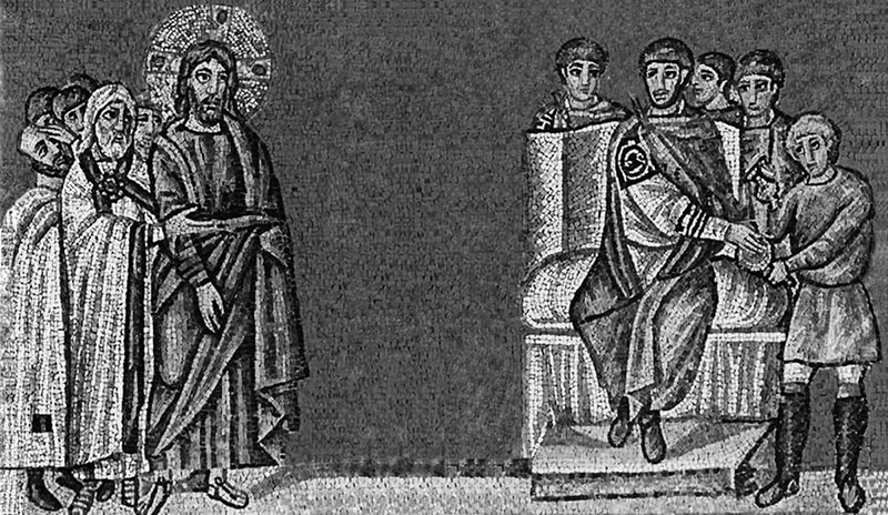Христос перед Пилатом, Пилат умывает руки. VI в. Мозаика южной стены базилики Сант-Аполлинаре Нуово, Равенна, Италия