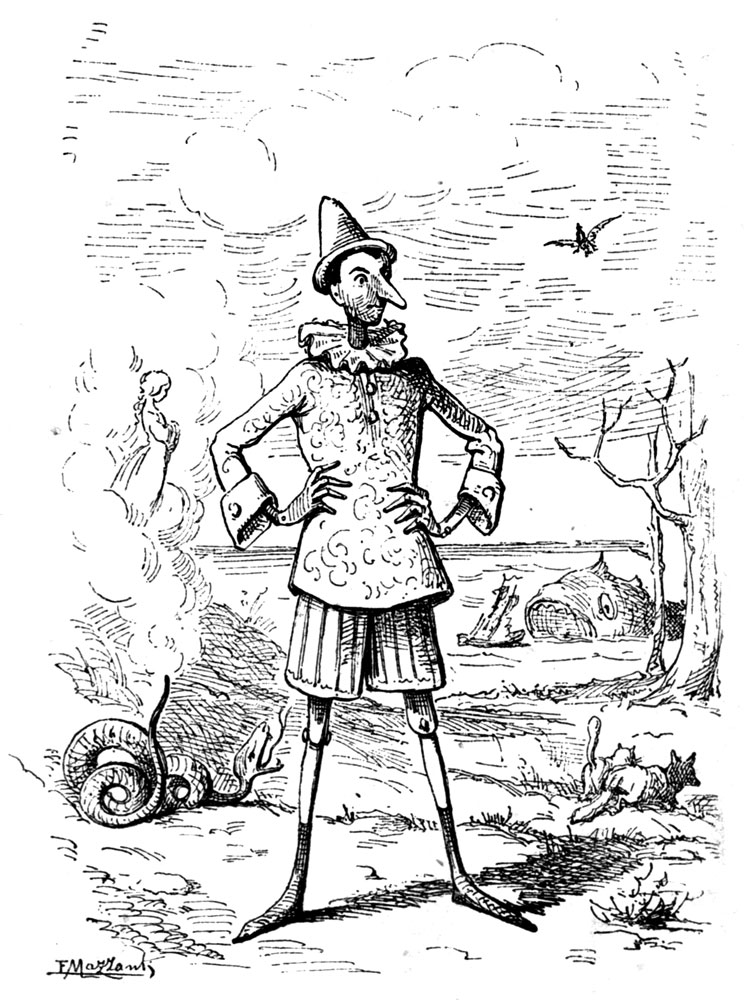 За много лет до этого Коллоди уже использовал аналогичный прием: в новелле, написанной специально для газеты «Фонарь», которой он тогда заведовал[19], он тоже высмеял традиционный сказочный зачин – если не с целью «убить сказку», то, по крайней мере, чтобы противопоставить ей свою историю. «Я не начну рассказывать вам, мои дорогие читатели, свою новеллу так, как делают это служанки: “Жил-был король”. Хотя бы потому, что в те времена не было никаких королей, а как тогда жилось – лучше или хуже, – мне неизвестно. Если же вы хотите это узнать – прочитайте мою историю и сами найдите в ней ответ». В общем, создается чувство, что король – основополагающий, но при этом отсутствующий элемент.