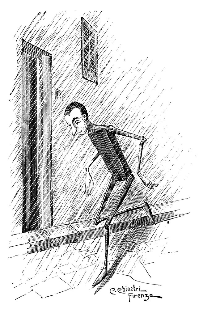 У меня перед глазами одно из изданий «Пиноккио», а именно то, что вышло во Флоренции в 1911 году стараниями Энрико Бемпорада с иллюстрациями Карло Кьостри. В нем шестая глава повести начинается следующими – пророческими – словами: «Стояла ни дать ни взять настоящая адская ночка»[4] (Era per l’appunto una nottataccia d’inferno). Однако Джорджо Манганелли в своем авторском «параллельном» комментарии замечает, что «в двух рассмотренных [им] текстах» значится вовсе не «адская ночка», а «ненастная зимняя ночь» (una nottataccia d’inverno). Из этого он делает вывод, что первый вариант прочтения неверный и подобную ошибку «крайне легко допустить и сложно выявить». Также он неосторожно добавляет: «Изначальная версия дает нам немало новых сведений: помимо прочего, она позволяет установить, в какое время года Пиноккио появился на свет».