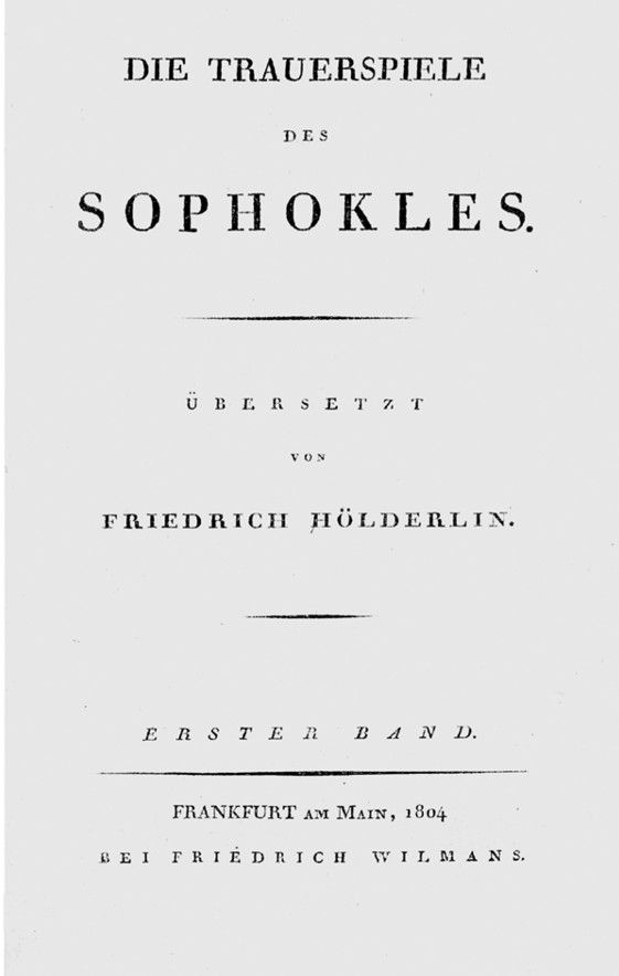 В апреле 1804 года издатель Вильманс выпускает переводы пьес Софокла «Эдип» и «Антигона»: их сопровождают два длинных комментария, в которых кратко изложены воззрения Гёльдерлина в их окончательном виде. Это последняя публикация поэта[8]; и, несмотря на огорчившие автора опечатки, без нее невозможно понять, что он подразумевал, когда рассуждал о вольном обращении с собственным и противопоставлял отечественному (национальному) чуждое, посредством которого переосмыслял взаимоотношения с греческими образцами. В письме, отправленном издателю в сентябре 1803 года, он так излагает суть своей задумки: