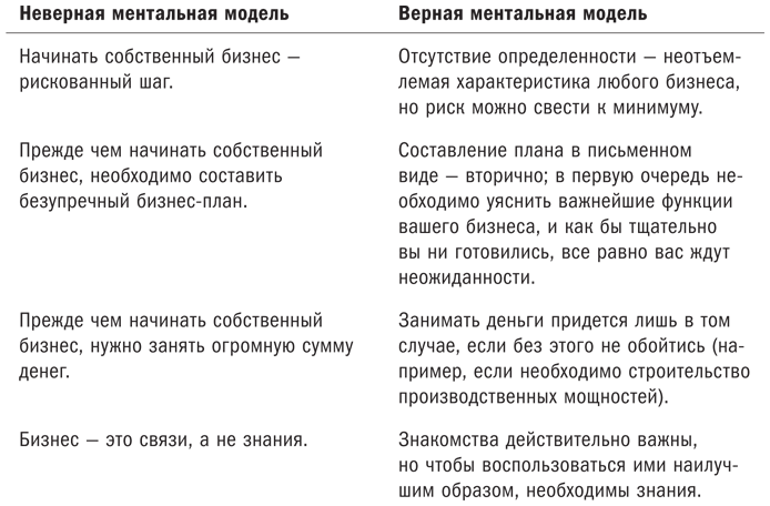 Например, многие полагают, что «начинать свое дело – весьма рискованный шаг», «чтобы открыть собственное дело, необходимо составить развернутый бизнес-план и занять кучу денег» и «бизнес – это связи, а не знания». Каждая из этих фраз и есть ментальная модель, но ни одна из них не является абсолютно верной. Корректировка ментальных моделей поможет вам более четко представлять, что вы делаете правильно, а что нет, и в результате принятые вами решения будут точнее.