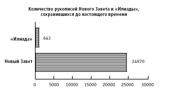 В настоящее время существует более пяти тысяч шестисот восьмидесяти шести известных греческих рукописей Нового Завета. Прибавьте к ним более одной тысячи копий латинской Вульгаты и, по крайней мере, девять тысяч триста других ранних версий рукописей, и мы получим на сегодня почти двадцать пять тысяч сохранившихся копий отдельных частей Нового Завета, если не больше. Ни один другой документ древности даже близко не может соперничать ни по количеству рукописей, ни по доказанности своей подлинности. «Илиада» Гомера в этом плане идет вторым по счету текстом, но это произведение насчитывает всего лишь шестьсот сорок три экземпляра сохранившихся копий. Первый полностью сохранившийся текст Гомера датируется XIII веком (Leach, ОВ, 145).