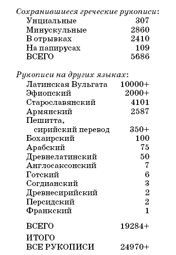 Информация для вышеприведенных таблиц была взята из следующих источников: Michael Welte of the Institute for New Testament Studies in Munster, Germany; Kurt Aland’s Journal of Biblical Literature, Vol. 87, 1968; Kurt Aland’s Kurzge-fasste Liste der Griechischen Handschriften des Neuen Testaments, W. De Gruyter, 1963; Kurt Aland’s «Neve Nevtestamentliche Papyri III», New Testament Studies, July, 1976; Bruce Metzger’s The Early Versions of the New Testament, Clarendon Press, 1977; New Testament Manuscript Studies, (eds.) Merrill M. Parvis and Allen Wikgren, The University of Chicago Press, 1950; Eroll F. Rhodes’s An Annotated List of Armenian New Testament Manuscripts, Tokyo, Ikeburo, 1959; The Bible and Modern Scholarship, (ed.) J. Phillip Hyatt, Abington Press, 1965.
