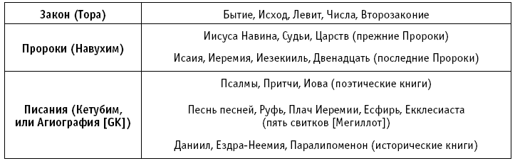 Ф. Ф. Брюс утверждает, что «еврейская Библия традиционно состоит из двадцати четырех книг, разбитых на три раздела» (Bruce, CS, 29). Три раздела – это Закон, Пророки и Писания. Именно такую классификацию еврейского канона вы найдете, например, в современных изданиях еврейского Ветхого Завета (ср. соответствие The Holy Scriptures с масоретским текстом и Biblia Hebraica, и3Д. Rudolf Kittel, Paul Kahle).