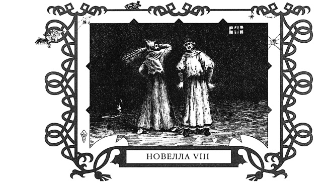 Болонский монах, когда Ферондо очнулся, не зная, где он, вошел к нему, страшно голося, с розгами в руках и, схватив его, дал ему хорошую порку. Ферондо, плача и крича, то и дело спрашивал: «Где я?» На что монах отвечал: «В чистилище». – «Как? – сказал Ферондо, – так я, стало быть, умер?» Монах сказал: «Разумеется». Поэтому Ферондо принялся плакать о себе, своей жене и сыне, говоря самые несуразные в свете вещи. Монах принес ему поесть и попить; увидя это, Ферондо спросил: «Вот те на! Разве покойники едят?» – «Да, – сказал монах, – а принес я тебе то, что твоя бывшая жена послала сегодня утром в церковь на обедню по твою душу; что по воле Божией тебе и предлагается». Сказал тогда Ферондо: «Господь да пошлет ей благовремение. Я-то любил ее очень, прежде чем скончался, так что всю ночь держал ее в охапке и ничего другого не делал, как целовал ее; делал также и другое, когда приходило желание». Затем у него явилась большая охота поесть, и он принялся есть и пить, и так как вино показалось ему не особенно хорошим, сказал: «Да накажет ее Господь, что она не подала священнику вина из бочки, что у стены». Когда он поел, монах снова принялся за него и теми же розгами дал ему великую порку. Порядком покричав, Ферондо спросил его: «Боже мой! Зачем ты это со мной делаешь?» Монах сказал: «Потому что так повелел Господь, чтобы так чинить над тобою два раза в день». – «А по какой причине?» – говорит Ферондо. Сказал монах: «Потому что ты был ревнив, имея женою достойнейшую женщину, какая есть в твоей местности». – «Увы мне! – сказал Ферондо, – правду ты говоришь! И самую сладкую жену. Она была слаще пряника, но я не знал, что Господу неблагоугодно, чтоб мужчина был ревнив, не то я не был бы таким». Сказал монах: «Это ты должен был понять, пока был на том свете, и исправиться; если случится тебе когда-нибудь вернуться туда, постарайся там удержать в памяти, что я теперь с тобой делаю, дабы никогда более не быть ревнивым». Ферондо спросил: «Разве кто умер, возвращается когда-нибудь туда?» – «Да, – отвечал монах, – кому попустит Господь». – «Боже мой, – сказал Ферондо, – если я когда-нибудь туда вернусь, буду лучшим в свете мужем, никогда не стану бить ее, не скажу бранного слова – разве побраню за вино, которое она послала нам сегодня утром, да еще не послала нам ни одной свечи, и мне пришлось есть впотьмах». Сказал монах: «Послать-то она послала, но свечи сгорели за обедней». – «Да, ты, может быть, и прав, – заметил Ферондо, – наверно, коли я вернусь туда, я позволю ей делать все, что хочет. Но скажи мне, кто ты, совершающий это надо мною?» Сказал монах: «Я также умер, а жил в Сардинии, и так как я когда-то хвалил моего господина за его ревнивость, Господь осудил меня на такое наказание, что я должен давать тебе есть и пить и угощать ударами, пока Господь все это решит иначе относительно тебя и меня». Сказал Ферондо: «Никого здесь нет, кроме нас двоих?» Монах отвечал: «Есть целые тысячи, только ты не можешь ни видеть, ни слышать их, ни они тебя». Тогда Ферондо спросил: «А как мы далеко от наших мест?» – «Охо! – ответил монах. – На много миль дальше, чем Славнонаворотим». – «Вот те на! Это очень далеко, – сказал Ферондо, – по моему мнению, мы теперь по ту сторону света, так это далеко».