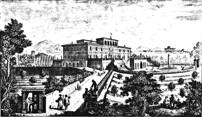 Вилла Villa Palmieri – это патрицианская вилла в городе Фьезоле, центральная Италия, из которой открывается вид на Флоренцию. Сады виллы на склонах ниже площади Пьяцца С. Доменико Фьезоле считаются райской обстановкой для каркасной истории Декамерона Боккаччо. Гравюра. Автор – Джузеппе Зокки. 1744 г.