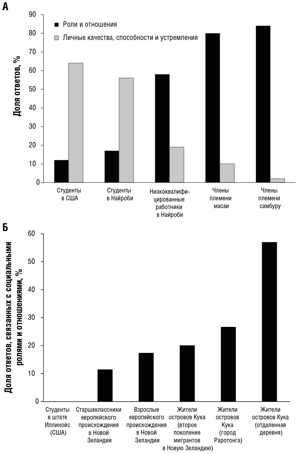 Рис. 1.1. Самовосприятие среди представителей различных популяций. (A) Опираясь на ответы на вопрос «Кто я?», верхняя диаграмма показывает склонность людей из разных популяций сосредоточиваться на своих ролях и отношениях по сравнению с личными качествами и достижениями. Высота столбцов соответствует средней доле ответов для каждого респондента в данной группе. (Б) Опираясь на варианты завершения предложения «Я ____», нижняя диаграмма показывает среднюю долю ответов, которые касались социальных ролей и отношений{34}