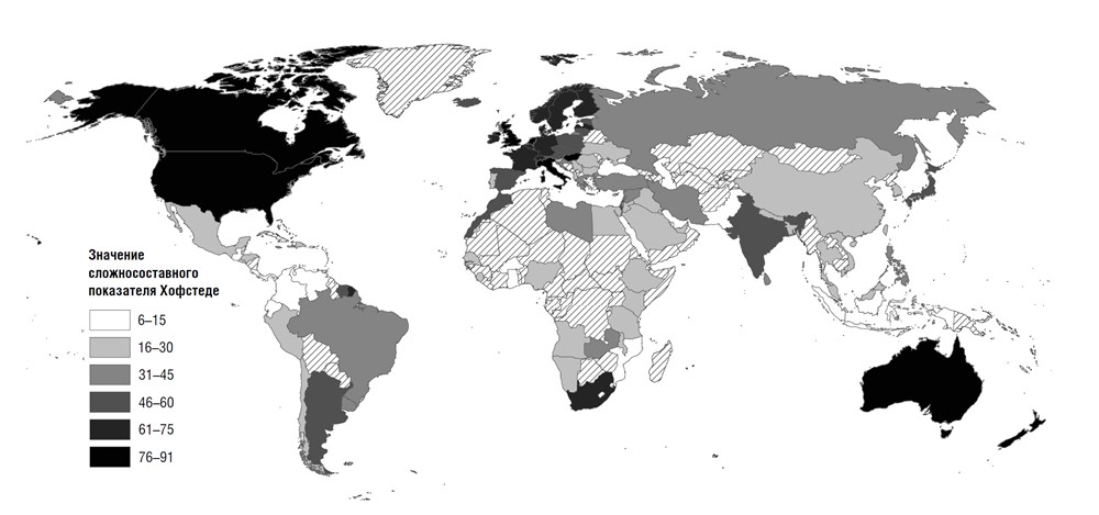 Рис. 1.2. Охватывающая 93 страны карта индивидуализма на основе сложносоставного показателя Хофстеде. Более темной заливкой отмечены государства, для населения которых в большей степени характерен индивидуализм. Для заштрихованных областей данные отсутствуют{41}