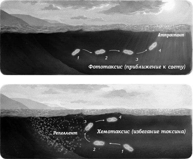 Независимо от среды обитания – будь то сад за домом, глуби́ны теплого моря или просторы Арктики, глинистые пруды или пустыни, мужской туалет на Центральном вокзале Нью-Йорка или ваша собственная прямая кишка, в которой бактерии выполняют токсическую или пробиотическую функцию, – бактериальным клеткам приходится справляться с теми же ключевыми задачами, что и людям, чтобы жить и здравствовать: избегать опасностей, распознавать и усваивать питательные вещества, а также источники энергии, управлять жидкостями и электролитами в организме. Для того чтобы их род выжил, организмы должны размножаться. Как и мы, бактерии должны удовлетворять многие необходимые для выживания потребности, в том числе за счет поведенческой вовлеченности в окружающую среду.