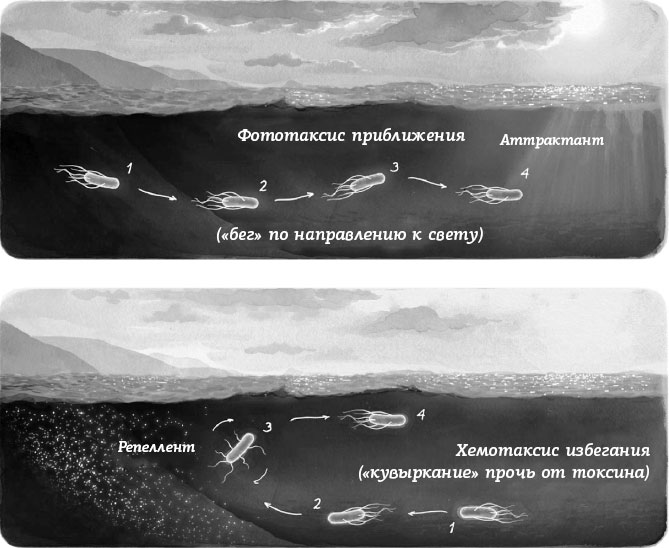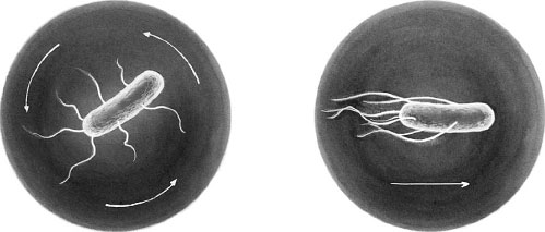 Многие бактерии подвижны: они выживают, ежедневно находясь в постоянном движении. Эти движения осуществляются своеобразными молекулярными моторами, контролирующими нитевидные образования – жгутики. С их помощью бактерии способны передвигаться, совершая два типа движений – «бег» и «кувыркание» (рисунок 8.1). Когда все жгутики вращаются в одном и том же направлении, бактерия «бежит», совершая направленное движение; когда жгутики вращаются в обратную сторону, бактерия «кувыркается», меняя направление.