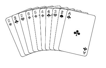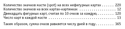 Иногда говорится, что общая сумма очков всех карт в колоде – если считать валета за 11, даму – за 12 и короля за 13 очков – равна 365, или числу дней в году. Это почти правильно, но не вполне. Число очков на всех картах составляет 364.