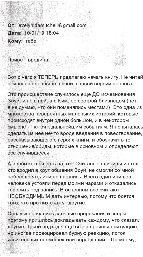 Весной 2017 года шумиха вокруг моей дебютной книги утихла, мы с Эвелин стали иногда встречаться за кофе или чем-нибудь покрепче, и разговор неизбежно сворачивал на текущую работу. Я писал свой второй роман, «Улыбающийся человек», и намеревался приложить все усилия к тому, чтобы он получился лучше первого. У Эвелин ситуация была совершенно иная. Она, по ее словам, изо всех сил пыталась найти тему для второй книги и отчаянно не желала скатываться в забвение. И в один прекрасный день вдруг подумала: «Что происходит с пропавшими девушками? С такими, как Зоуи Нолан?» Я поддержал этот интерес, потому что видел ее отчаяние и хотел проявить доброту. Однако постепенно работа захватила все мое внимание, у меня все чаще находился предлог отменить встречу за кофе или чем покрепче. В периоды интенсивной работы я спокойно неделями обходился без общения с друзьями и родственниками, мог месяцами не проверять электронную почту. Обычно терял счет времени, забывал о людях, хотя, возможно, это было просто способом пропасть с радаров. В Эвелин, с ее поношенной одеждой, с ее однушкой и застопорившимися проектами, мне виделись смутные очертания собственного будущего, где не будет больше успеха и взлетов, только оставшиеся без ответа звонки, отписки и бесконечное падение. Писатели с суеверием относятся к неудаче, считают ее заразной. Наши разговоры стали прохладнее, дружба свелась к обмену короткими приветствиями. Письма стали приходить раз в неделю, раз в месяц, потом раз в три месяца и вскоре иссякли. Но 25 июня 2018 года я получил письмо с интригующим заголовком «История настоящего преступления».