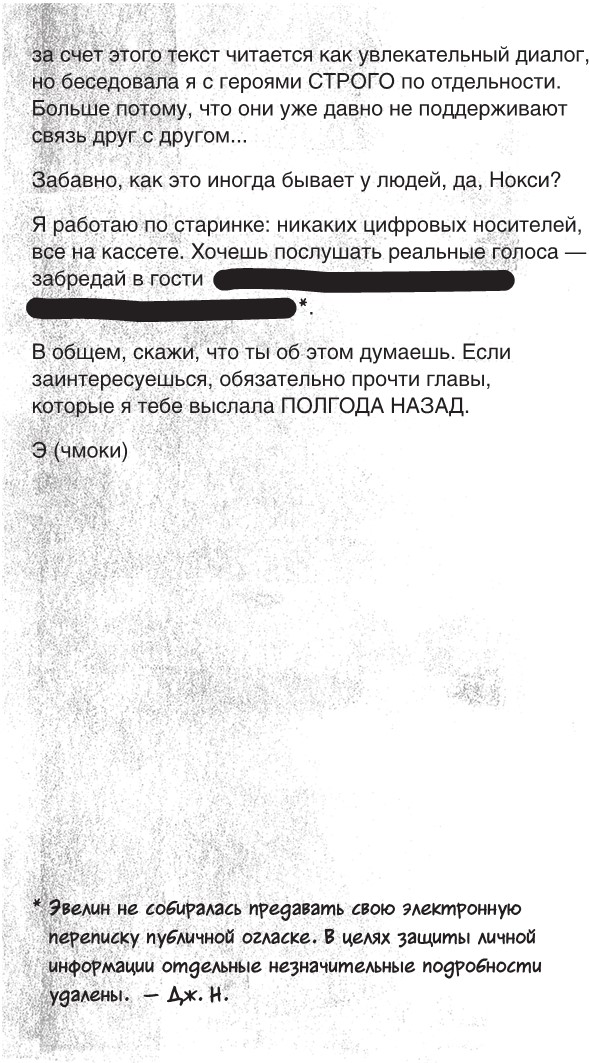 Спустя примерно полгода одно неординарное происшествие поставило под вопрос устоявшуюся версию событий. Я написал Эвелин, что, пожалуй, она с самого начала была права. Эвелин тут же откликнулась, попросила пока не читать первый присланный файл, потому что новая информация пролила свет на важный и прежде непонятный элемент повествования и наконец-то найден идеальный материал для первых глав.