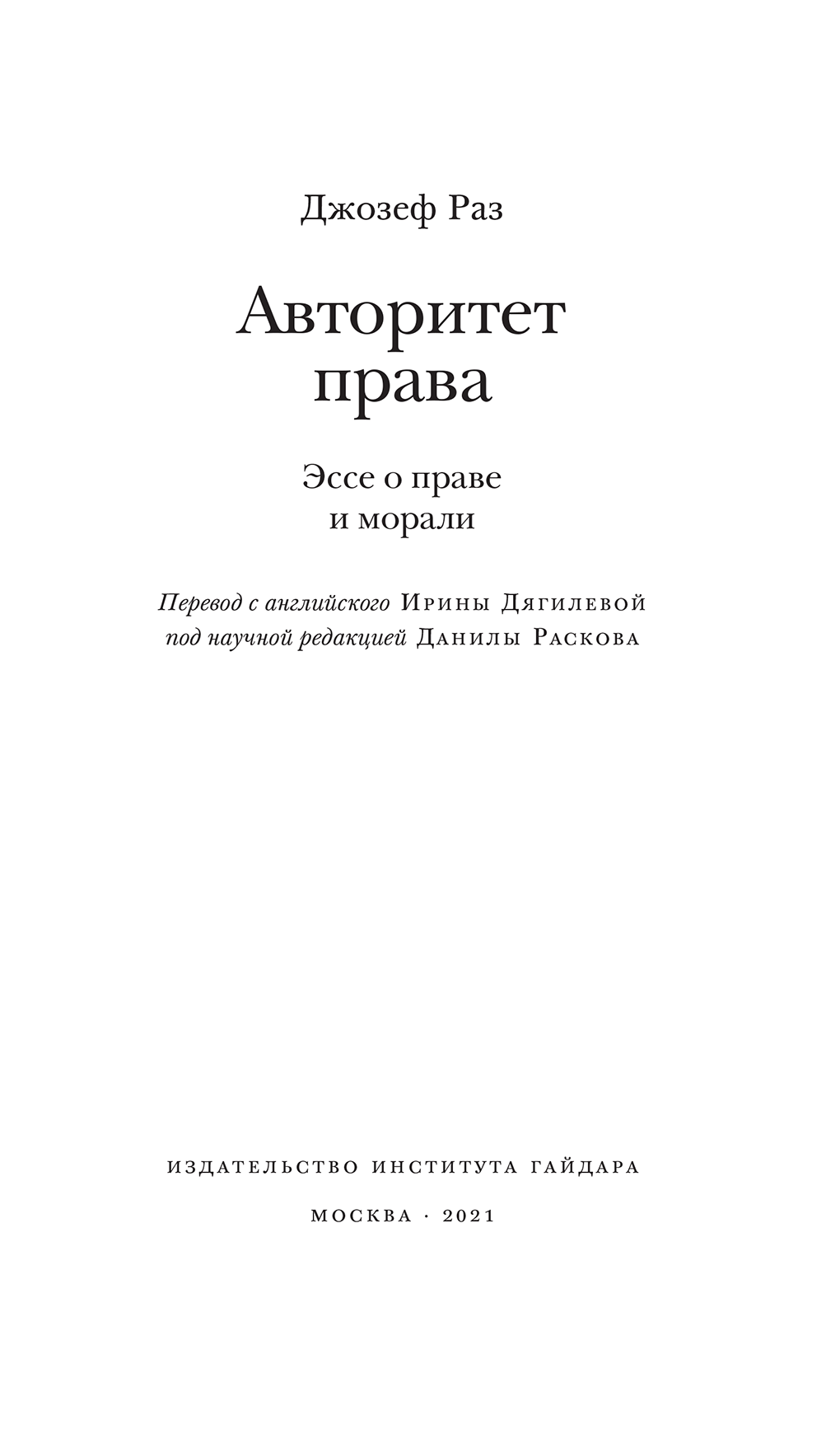 “The Authority of Law: Essays on Law and Morality”, second edition, by Joseph Raz was originally published in English in 2009. This translation is published by arrangement with Oxford University Press. Gaidar Institute Press is responsible for this translation from the original work and Oxford University Press shall have no liability for any errors, omissions or inaccuracies or ambiguities in such translation or for any losses caused by reliance thereon. Книга «Авторитет права. Эссе о праве и морали» под авторством Джозефа Раза первоначально была опубликована на английском языке в 2009 году. Настоящий перевод публикуется по соглашению с Oxford University Press. Издательство Института Гайдара несет ответственность за настоящий перевод оригинальной работы, и Oxford University Press не несет никакой ответственности за какие бы то ни было ошибки, пропуски, неточности или двусмысленности в переводе или любой связанный с этим ущерб.