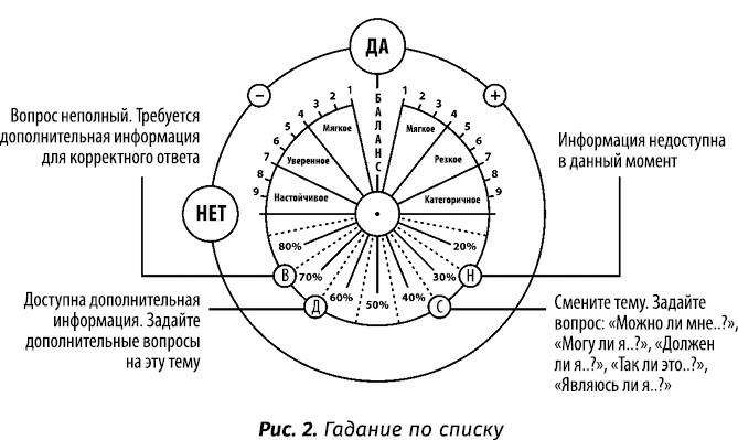 Помните: вопросы должны быть краткими и конкретными. Если вы гадаете по пальцам, спросите: «Является ли (название кристалла) лучшим и наиболее подходящим кристаллом для лечения моей головной боли в данный момент?» Если вы гадаете с помощью маятника, попросите: «Пожалуйста, покажи мне лучший и наиболее подходящий кристалл для лечения моей головной боли сейчас». Также можете воспользоваться рисунком 2 «Гадание по списку» и задать вопрос: «Существует ли более глубокое болезненное состояние, лежащее в основе моего симптома?» Если ответ «да», спросите: «Находится ли это болезненное состояние на физическом (подождите мгновение, пока маятник отреагирует), эмоциональном (подождите мгновение), ментальном (подождите мгновение) или душевном (подождите мгновение) уровне?» Затем вы можете воспользоваться справочником и по очереди провести пальцем по каждой букве алфавита. Когда вы получите ответ «да» от маятника, ведите пальцем вниз по странице, пока маятник не обнаружит глубинную причину вашей болезни. Как работать с маятником, смотрите в разделе «Гадание с помощью маятника».