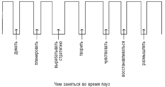 Когда мы берем паузу, многое становится лучше. Мы на миг останавливаемся перед тем, как отправить стимулирующее письмо, потому что хотим убедиться в том, что основная мысль ясна. Мы останавливаемся и отдыхаем, если чувствуем усталость, которая не дает сосредоточиться. Мы на несколько минут отходим в сторонку между совещаниями и деловыми встречами, чтобы усвоить и понять то, о чем говорилось на предыдущей встрече, и как следует подготовиться к следующей. Время, прибереженное для таких периодов, меняет саму природу работы.