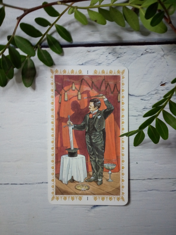 На карте мы видим мужчину. Явно фокусника, который в совершенстве владеет этим искусством. Одет очень стильно, аккуратно. Окружающая обстановка очень напоминает сцену. Обилие красного цвета. На шторе тень. Вокруг фокусника мы видим все предметы мастей: меч, жезл, пентакль и позади, справа кубок.