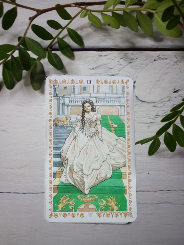 На карте мы видим девушку, спускающуюся по ступеням дворца. Ее платье кремового цвета, на голове диадема, взгляд потухший и уставший. За ее спиной играет собака с щенками. Под ногами девушки зеленая ковровая дорожка, в конце которой рисунок очень похожий на герб.