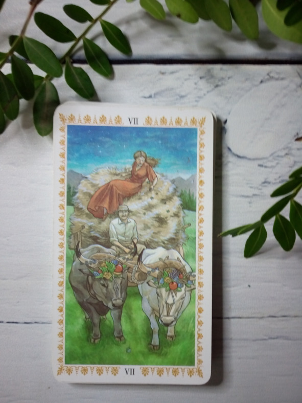 Обратим внимание на цвета карты. Бежевый цвет указывает на стабильность, теплоту, спокойствие и умиротворенность. Оттенки голубого указывают на влияние разума, разговоры.